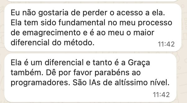 Solução: IA com comunicação humanizada que acompanha pacientes 24/7, monitora evolução e reforça adesão ao tratamento, com dicas pertinentes e informações das dietas.